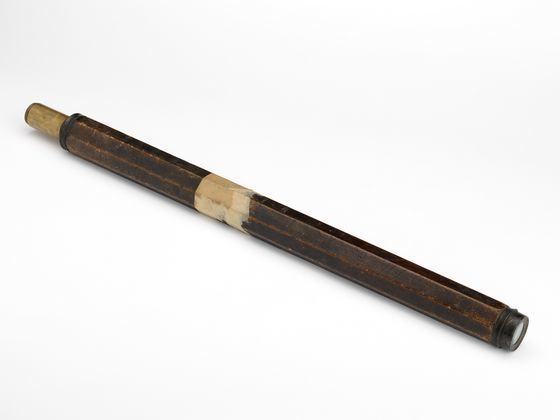 "The octagonal mahogany barrel, which is now damaged, is characteristic of telescopes produced in the 18th century for use on board ship. The barrel was designed for strength, since the techniques for manufacturing strong round barrels were not well developed at this time. The brass fittings include a single draw tube on which the maker’s name is inscribed as ‘Dollond, / London’. This was the firm started by the London optical instrument maker Peter Dollond (1731–1820). It was Peter's father, John Dollond (1706–61), who took out a patent for the achromatic lens in 1758. This type of lens eliminated the problem of coloured fringes caused by the distortion of light as it passed through the glass. The objective lens cap and parts of the eyepiece are now missing" (Royal Museums Greenwich).