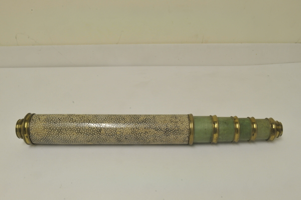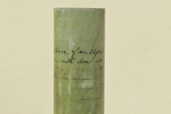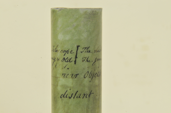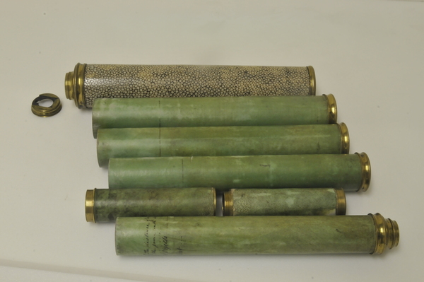 "This non-achromatic telescope has a rayskin-covered barrel and four draw tubes made of vellum. The other fittings are brass. Both the objective and eyepiece lenses had sliding lens covers, although the cover for the objective lens is now missing. Solid black lines around the draw tubes indicate the optimum working length of the telescope. The maker's name and date are engraved on the objective lens: 'John Cuff, Londini. Fecit.1736'. John Cuff (1708-92), a maker of spectacles and optical instruments, worked in Fleet Street" (Royal Museums Greenwich).