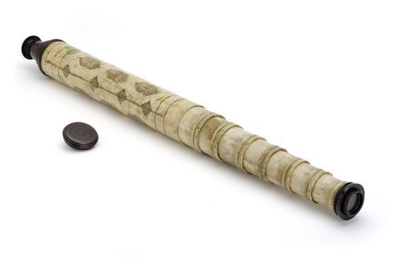 "The barrel of this non-achromatic telescope is made of vellum that has been decorated with gold-tooled motifs. There are seven draw tubes made of white vellum with gold-tooled decoration on the collars. The lenses are set in turned ebony mounts and the objective lens has a screw-on ebony cap. Black stop lines around the draw tubes indicate an optimum working length of over 1700 mm. The length of the telescope indicates that it was to be used for astronomical observations in conjunction with some form of support to keep it steady. The telescope had to be long since it was only possible at this time to produce accurate lenses with fairly long focal lengths. The style of the telescope suggests it was made in England around 1700. In particular, the style is similar to that of examples made by the London instrument maker Christopher Cock (worked about 1697)" (Royal Museums Greenwich).