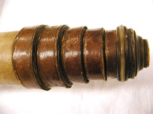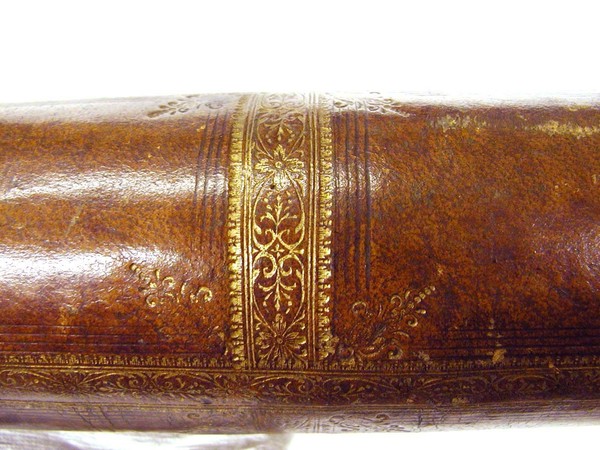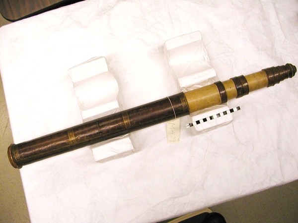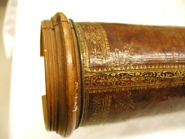 Large diameter main barrel and ferrules covered with brown parchment tooled in gold. Parchment is badly chipped. Eight draw tubes covered with combed marbled paper. Wooden objective cap. The 83 mm diameter lens is pale yellowish in color and has beveled edges. The objective lens is missing.