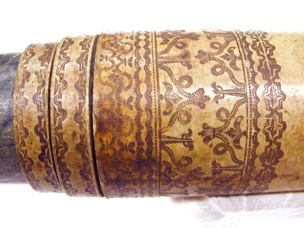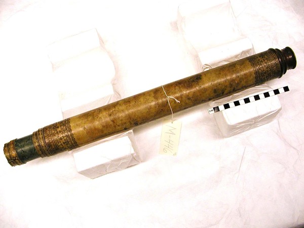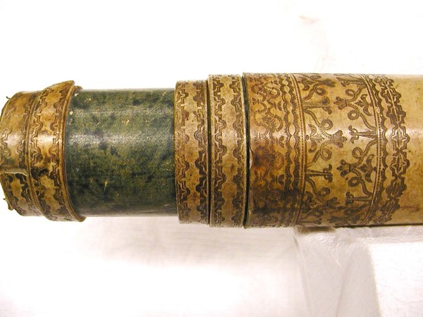 Browned vellum main tube and ferrules with blind tooling. Four green vellum draw tubes with faint, diffuse dark decorations. Wooden lens cells, brass slider on eyepiece. Signature is on the objective lens.