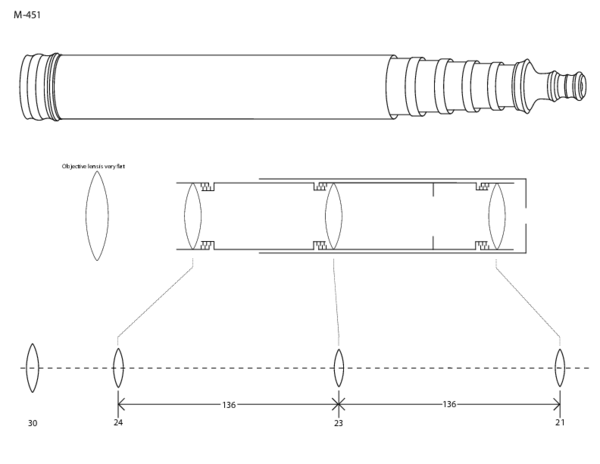 Closed telescope measures 462 mm in length with a 45 mm diameter.
