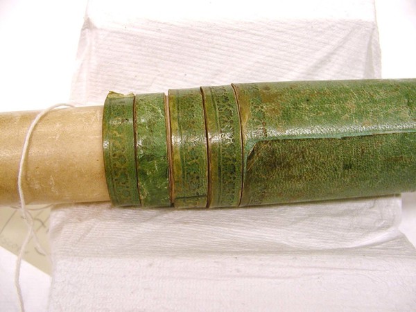 Main tube and ferrules covered in green vellum with a small amount of tooling. Five white vellum draws. Wooden lens cells on both ends with brass section for sliders. The objective cap slider is missing.