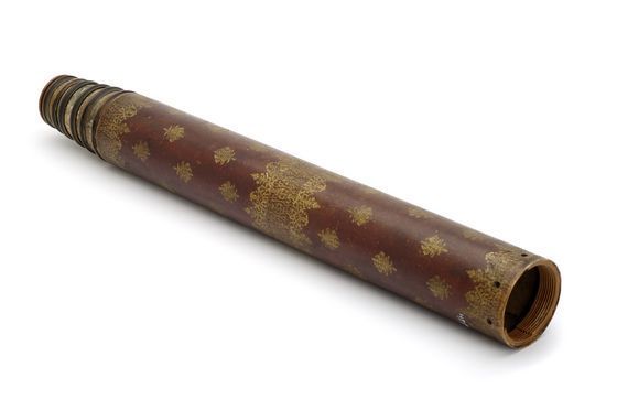 "The barrel of this non-achromatic telescope is covered in red leather that is decorated with gold-tooled motifs. There are five draw tubes covered in marbled paper. The other fittings are of turned wood and bone. The objective lens and some of the fittings are now missing. This telescope is assumed to have been made in France because of an inscription on one of the draw tubes in French. Telescopes in this period had to be long, since lenses with long focal lengths were used in order to minimise chromatic aberration - the appearance of coloured fringes around the object being viewed. The stop lines drawn onto the draw tubes of this telescope indicate a maximum optimum working length of over 1600 mm" (Royal Museums Greenwich).