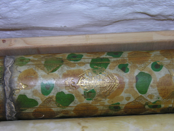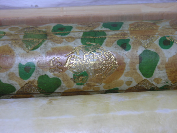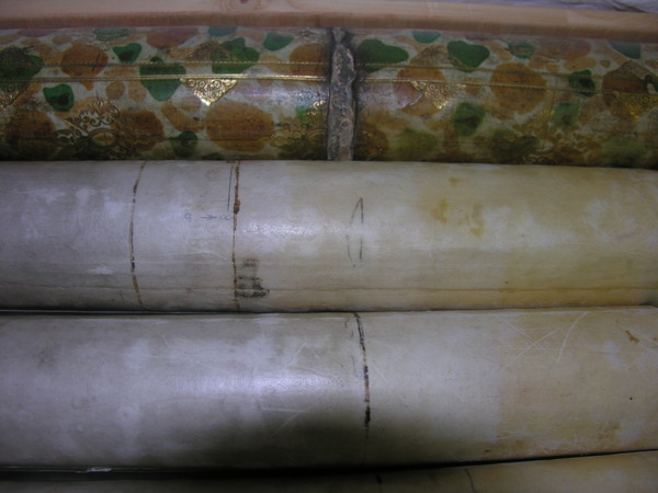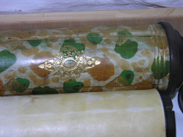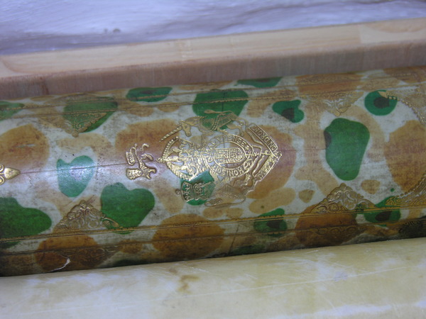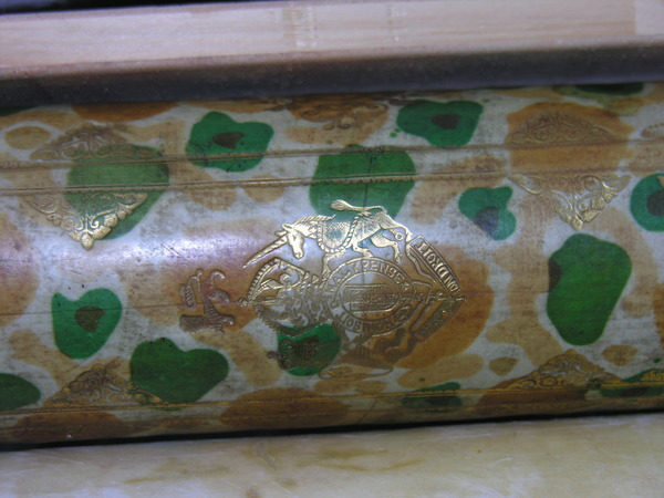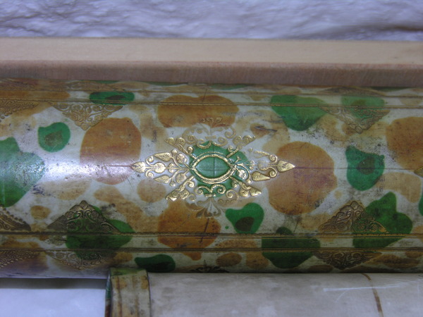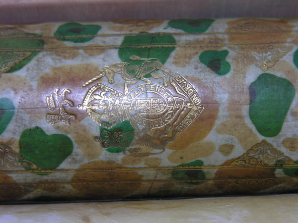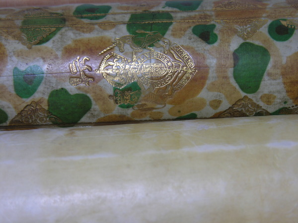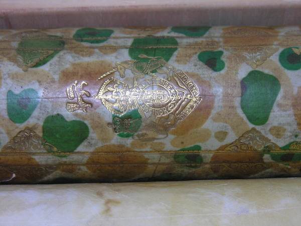 Paper tubes. Outermost of white, green, and brown-flecked parchment; inner tubes of white parchment. Ocular tube bears goal-leaf coat of arms. Similar to scopes by Christopher Cock, though catalogue states this telescope likely by "J. M. Dobler Opticus Berolini."