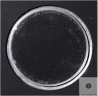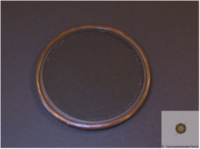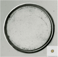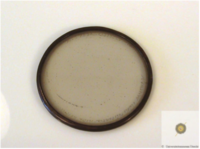 Grayish glass. Objective lens with which Christiaan Huygens discovered Saturn’s moon Titan. On the rim of the lens are engraved the focal length “X [pedes]”, the date when the lens was finished “3 FEBR. MDCLV”, and the first part of the anagram, “Admovere oculis distantia sidera nostris”. Plano-convex lens Ø 5,7 cm. Focal length measured as 336,7 cm. Radius of curvature, front: 176 cm; ibidem back: flat. Maximum thickness 0,34 cm.