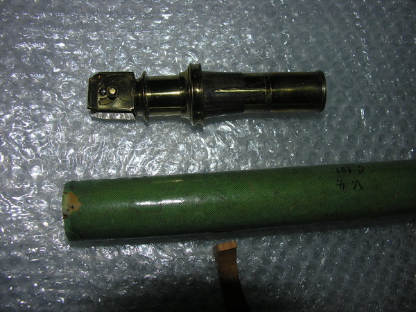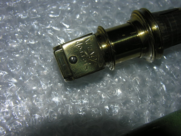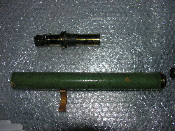Middle tube of brown wood, thickness 2.5 mm, with cover of green-dyed fish skin. Objective and ocular side pulls; both pulls as well as objective and ocular lens mounts of gold-plated brass. Two objective lenses in [Wurfelrevolver], simple convex. Signature on the lens turret.