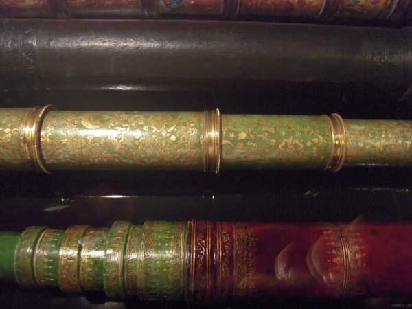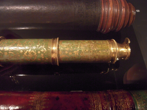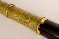 "English telescope. Main tube covered with tortoiseshell. Four drawtubes covered with green marbled leather, richly tooled with floral motifs, stars and crescents (almost identical to the preceding telescope). Brass curved fittings and protective slides. Unsigned. Presumably mid-eighteenth century" (Louwman and Zuidervaart, 2013).