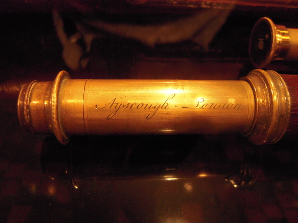 "Small maritime telescope. Cylindrical wooden main tube, with a brass drawtube and ditto fittings. Signed: ‘Ayscough London’. Length 2643 cm, Ø 3 cm. Made between 1748 and 1759" (Louwman and Zuidervaart, 2013).