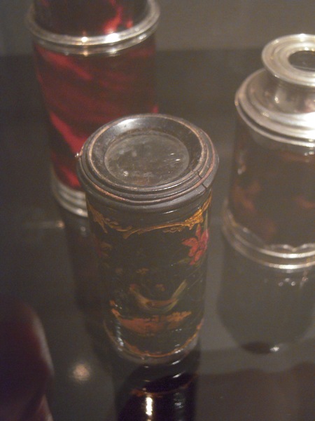 "Spyglass with a black lacquered body, decorated among others with a bird and flowers on lacquered wood. Short green drawtube with gold tooling. Length 7-10 cm, Ø 3 cm. Unsigned, but the decoration and tooling is characteristic of Pietro Patroni from Milan. First half of the eighteenth century.