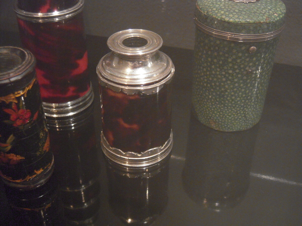"Drawtube covered with red morocco, tooled with floral motifs. With its original wooden case, covered with green ray skin. Length 9 cm, Ø 5 cm. Signed: ‘Dollond London’. Last quarter of the eighteenth century .