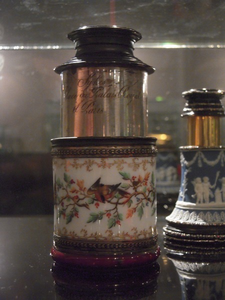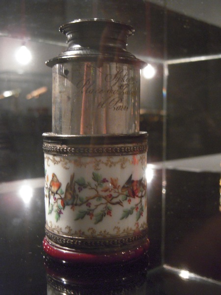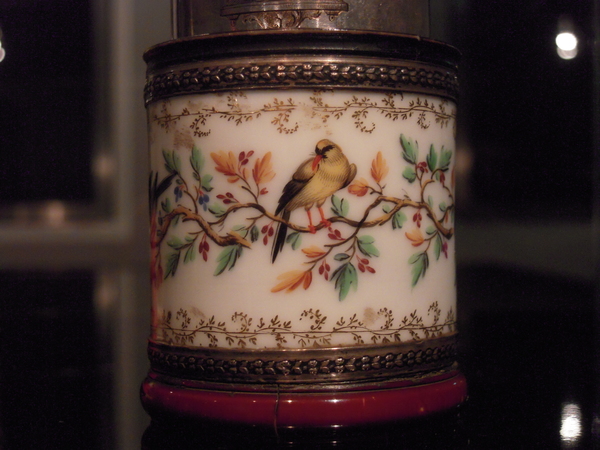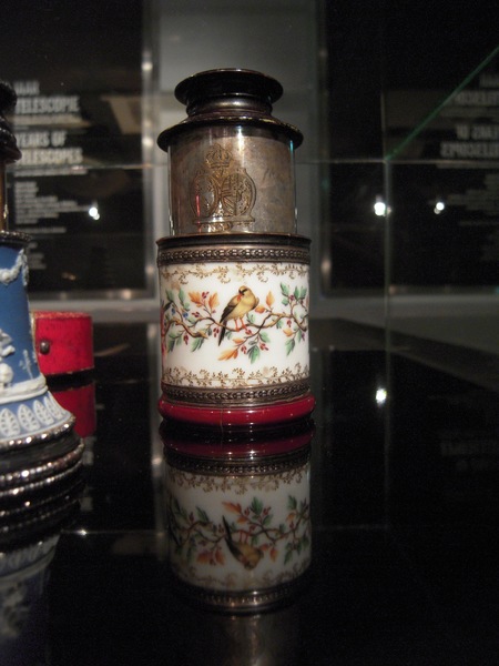 "Hand held spyglass. Body made of Vincennes porcelain, with a polychrome decoration of birds on branches, with a short silver drawtube on which the combined coat of arms of the families Bourbon and Von Habsburg Lotharingen has been engraved. Ferrules of black coloured ivory . Signed: ‘Sykes / Place du Palais Royal / a Paris’. Length 9-18 cm, Ø 4.5 cm. Ca. 1785.