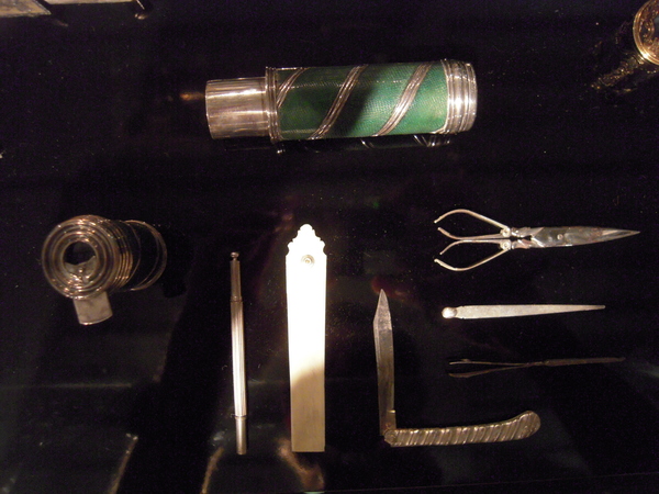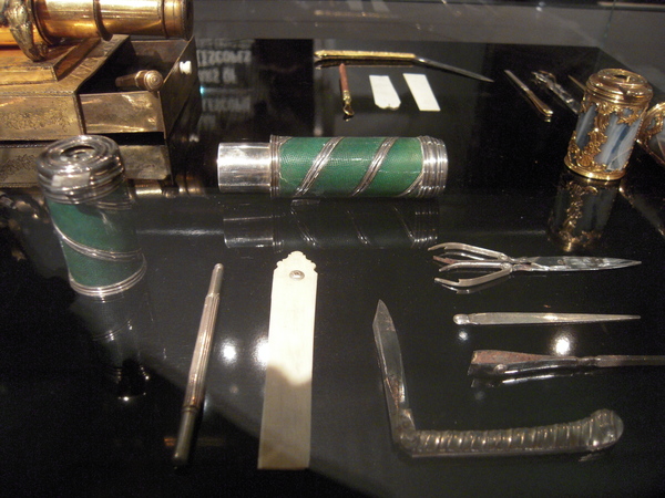 "Small spyglass combined with a sewing kit (length 11.5 cm). Covered spiroidly with green coloured and polished lizard leather between silver fittings. Unsigned, but attributed to Thomas Ribright, who according to a 1749-patent had the exclusive right of producing this kind of luxurious telescopes with accessories. Third quarter of the eighteenth century" (Louwman and Zuidervaart, 2013).