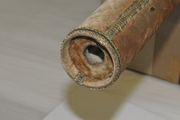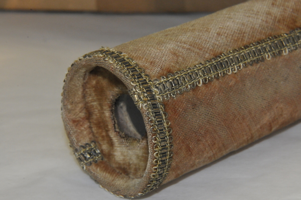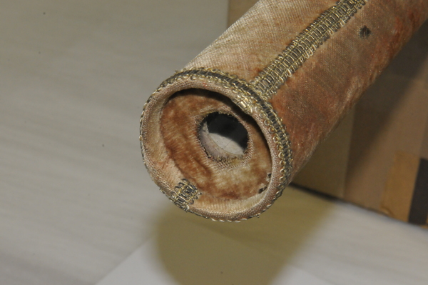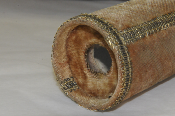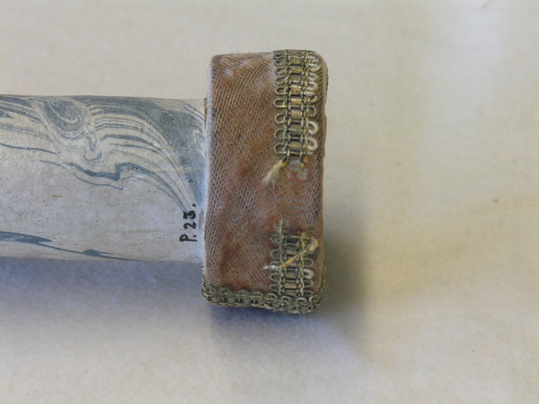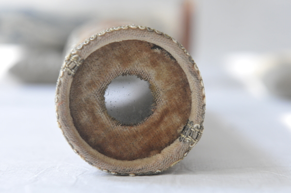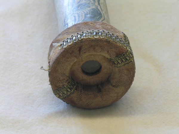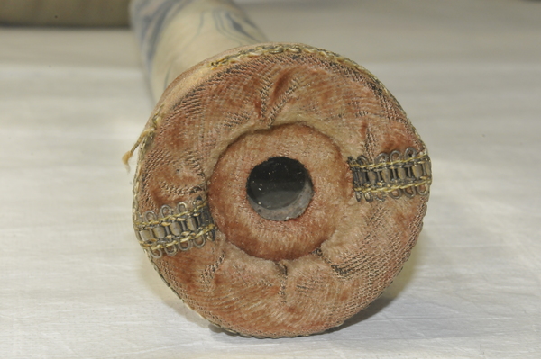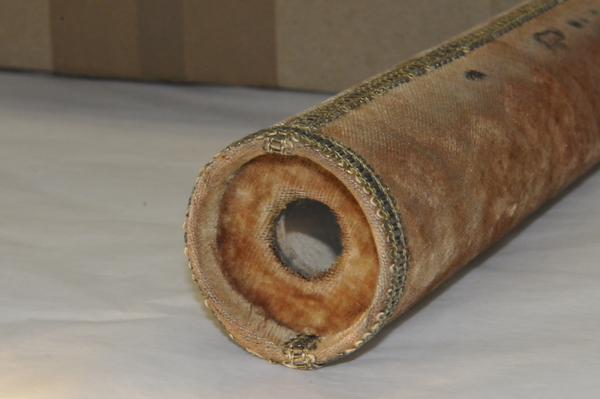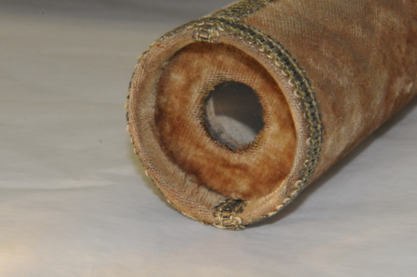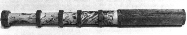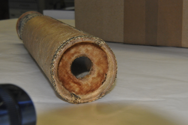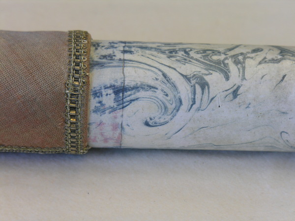 Main tube and five draws constructed of pasteboard. Each draw covered in marbled paper; end tube and ring stops in silk velvet embroidered by gold thread. Collapsed, rings and end tube form cylinder with common outer diameter (48 mm), common feature of other early scopes.