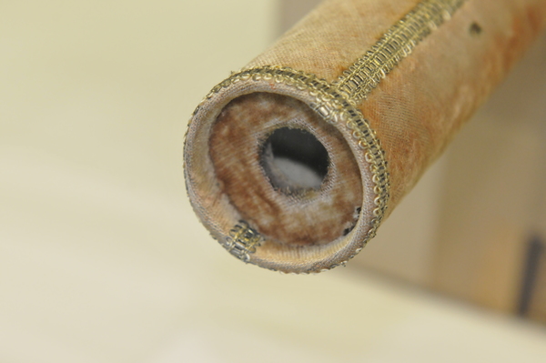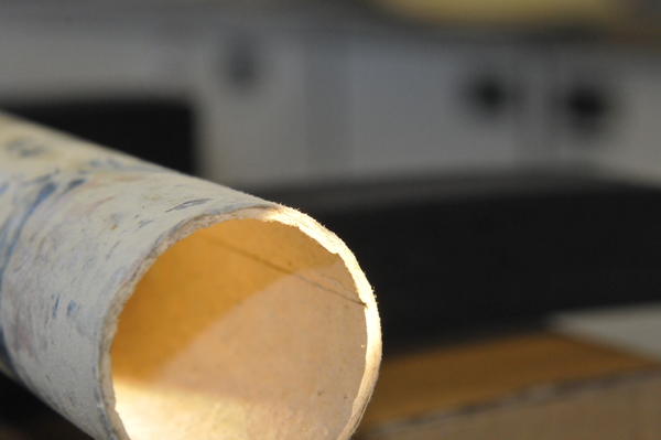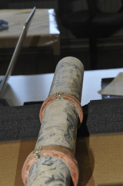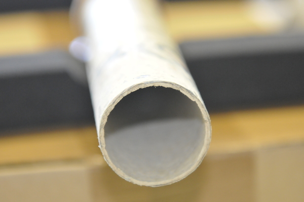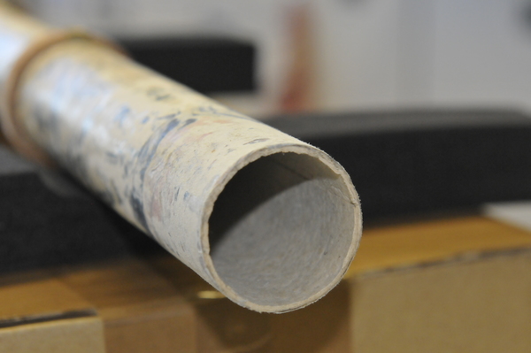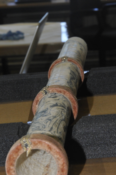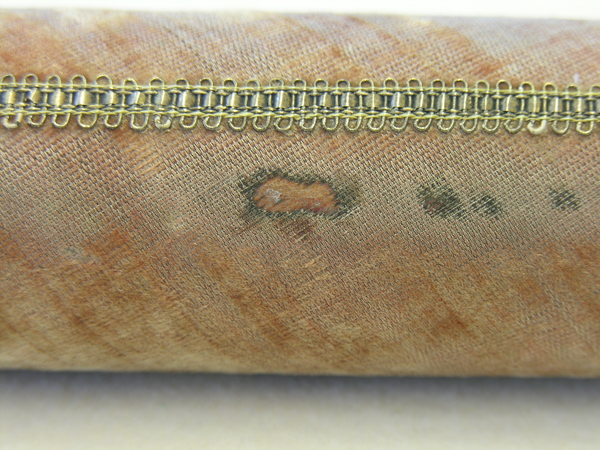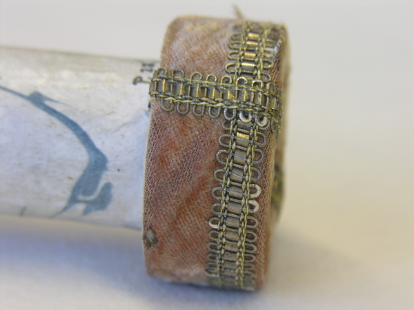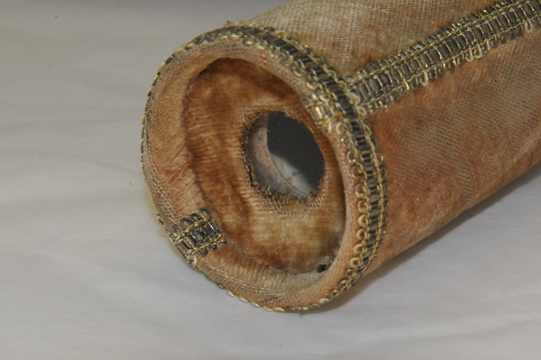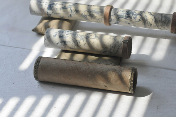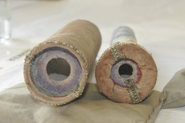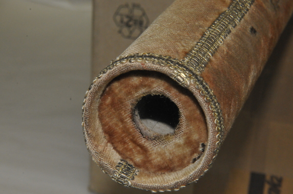 Main tube and five draws constructed of pasteboard. Each draw covered in marbled paper; end tube and ring stops in silk velvet embroidered by gold thread. Collapsed, rings and end tube form cylinder with common outer diameter (48 mm), common feature of other early scopes.