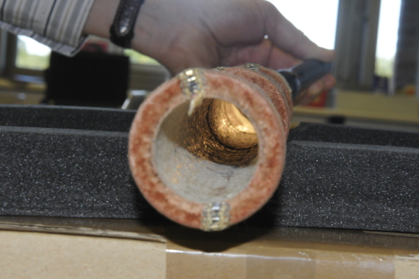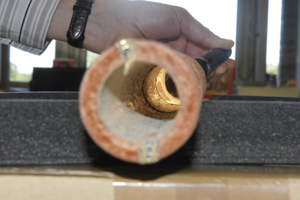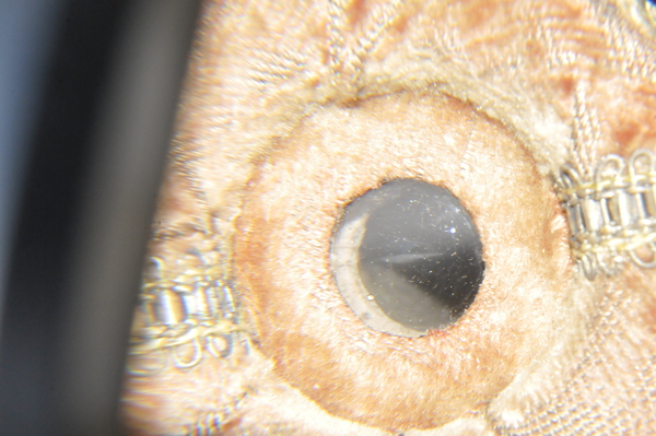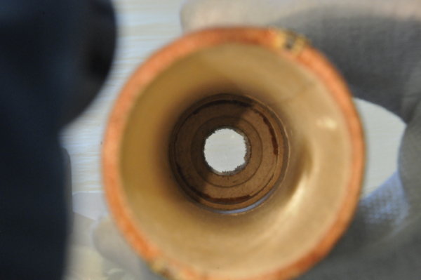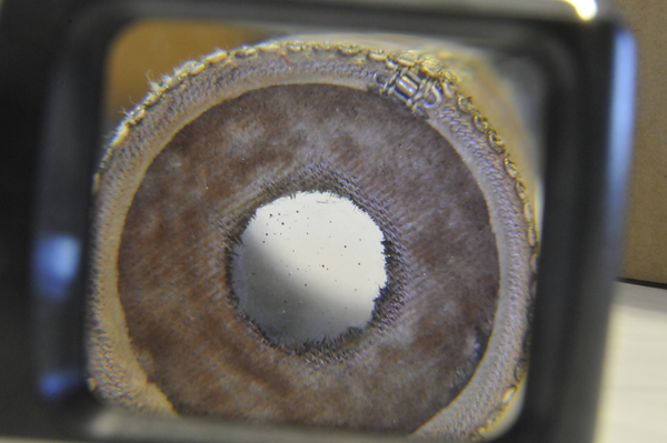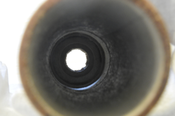 Lens is plano-convex with grozed edge. Full aperture 38.4-41.4 mm. Free aperture 16.3-17.4 mm. Velvet aperture of the objective: 41.4 (full) and 16.9 (free). Lens is possibly devitrifying or crizzling. When the telescope tubes are extended to extension marks. the lens separation measures 900 mm. Distant objects are in focus at that separation. Objective focal length of about 960 mm implies an ocular focal length of 60 mm, and a magnification of 16. Lots of bubbles in the lens. Color of objective is slightly yellow, whereas ocular showed a distinct bluish or grayish tint.