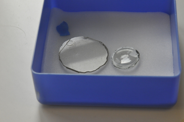 Lens is plano-concave with grozed edge. Full aperture: 22.9-23.8 mm. Central well: 19.6 mm. Thickness: 2.2 mm.