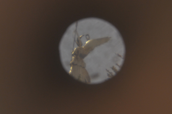 Field of view is only about 4 m at a distance of 1000 m, or under 15 arc minutes, for an eye pupil opening of 6 mm, but it gives a surprisingly clear and sharp (upright) image (Riekher, 1990).
