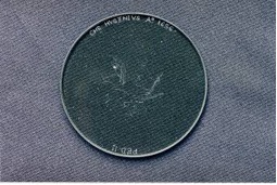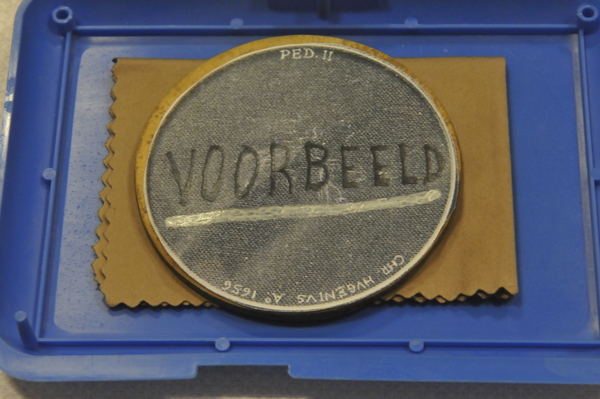 "Objective lens, polished by Christiaan Huygens, signed: ‘CHR. HVGENIVS Ao 1656 – PED II’ [= 11 feet or 335 cm]. The actual focal length has been determined in the optical laboratory of Rolf Willach as 365 cm. Biconvex lens Ø 6.2 cm. Radius of curvature: on the front side (with inscription) 400 cm; on the back 408 cm. Maximum thickness: 0.34 cm. Colour: grey-green. Many small bubbles in the lens. A paper diaphragm with an opening of 3.4 cm belonging to this glass has been preserved as well" (Louwman, and Zuidervaart, 2013).
