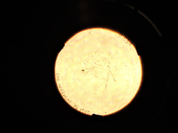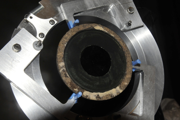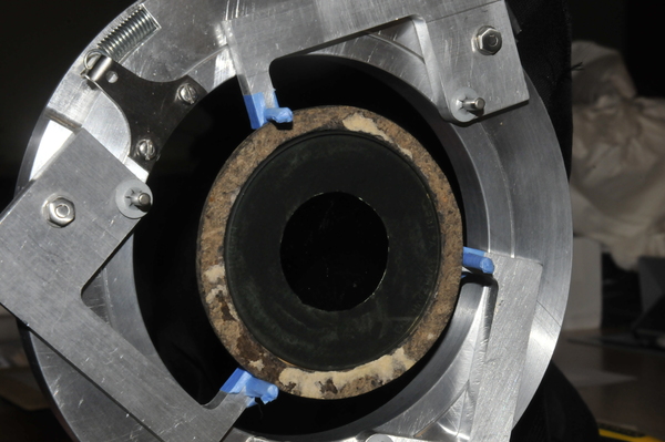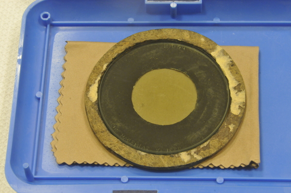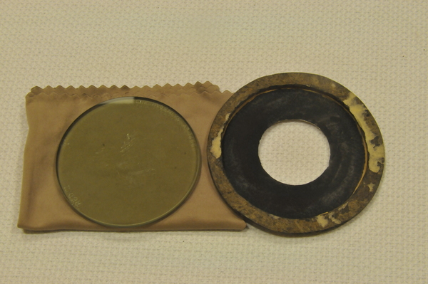 This lens sits in a pasteboard well with a paper diaphragm on the reverse. The outer diam of the cell is 75.9 mm. There is writing on the black underside of diaphragm. Measured focal length of 3450 mm for outer edge (70% zone) at 5460 mm. After removing the stop blocking the central portion of the lens, and placing the lens in its original holder, which reduces the aperture from 62.3 mm to 30.9 mm, allowing only the central rays to pass through, the focal length increases significantly to 3635 mm. Ronchigrams show significant spherical aberration outside the zone of the original aperture stop, as expected. Objective is nearly equally biconvex, with the starside registering just over 4100 mm radius of curvature, the eyeside is typically a little shallower at 4150-4200 mm, when using a 40mm spherometer bell. A smaller spherometer bell (12.5 mm) showed a surprising variation from +-spot to spot, not just from center to edge. The 25 mm bell showed starside c 3500 mm (+/- 150), eyeside shallower but ranging from 3400 to 4000. The 12.5 mm bell reveals confusing data, all concave readings.