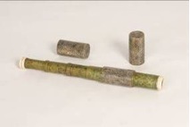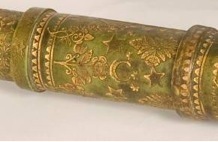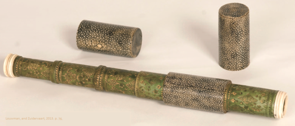 "English telescope. The main tube of the telescope is part of the casing, which is completed by two extended end caps. These parts are covered with grey coloured ray skin. The other tubes (among which three drawtubes) are covered with green coloured leather, richly tooled with floral motifs, stars and crescents. The gold tooling used is not mentioned by Turner (1966), but seems to be related to the Turner nos. 44 (flower), no. 47 (crescent with a five pointed star) and no. 51 (flower with leaves). Ivory fittings at both tube ends. Length 22-55 cm, Ø 4 cm. Unsigned, but an almost identical telescope in the British Museum is signed: ‘Howe’.