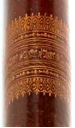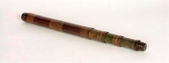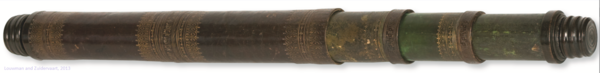 "Presumably French telescope. Main tube and ferrules covered with dark leather, richly gilded with fine gold tooling, with a lace pattern, that is used on both French and Italian telescopes. Three pasteboard drawtubes covered with green coloured leather. Compound eyepiece with three lenses. Wooden end pieces. Unsigned. Maximum length 65 cm, Ø 5 cm. Last quarter of the seventeenth century" (Louwman and Zuidervaart, 2013).
