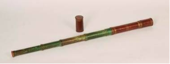 "Presumably French telescope. Main tube (length 20 cm) and caps, covered with Bordeaux red leather with gold tooling. Four pasteboard drawtubes covered with green leather. Maximum length 64 cm, Ø 5.5 cm. Unsigned. First quarter of the eighteenth century" (Louwman and Zuidervaart, 2013).