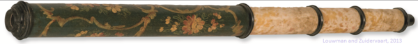 "Presumably Italian telescope. Main tube painted with floral motifs on a green background. Three lightly marbled pasteboard drawtubes. Ferrules made of horn and ditto end pieces. Unsigned. Length 47-117 cm, Ø 5 cm. Late eighteenth century" (Louwman and Zuidervaart, 2013).
