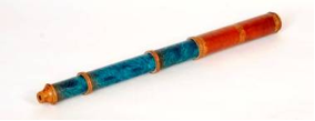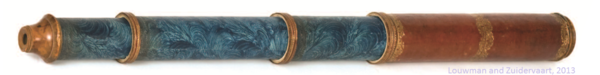 "Presumably Italian telescope. Main tube covered with red paper with gold tooling. Three pasteboard drawtubes covered with blue paper. Ferrules and end pieces made from palm wood. Unsigned. Length 32-87 cm, Ø 5 cm. Late eighteenth century" (Louwman and Zuidervaart, 2013).